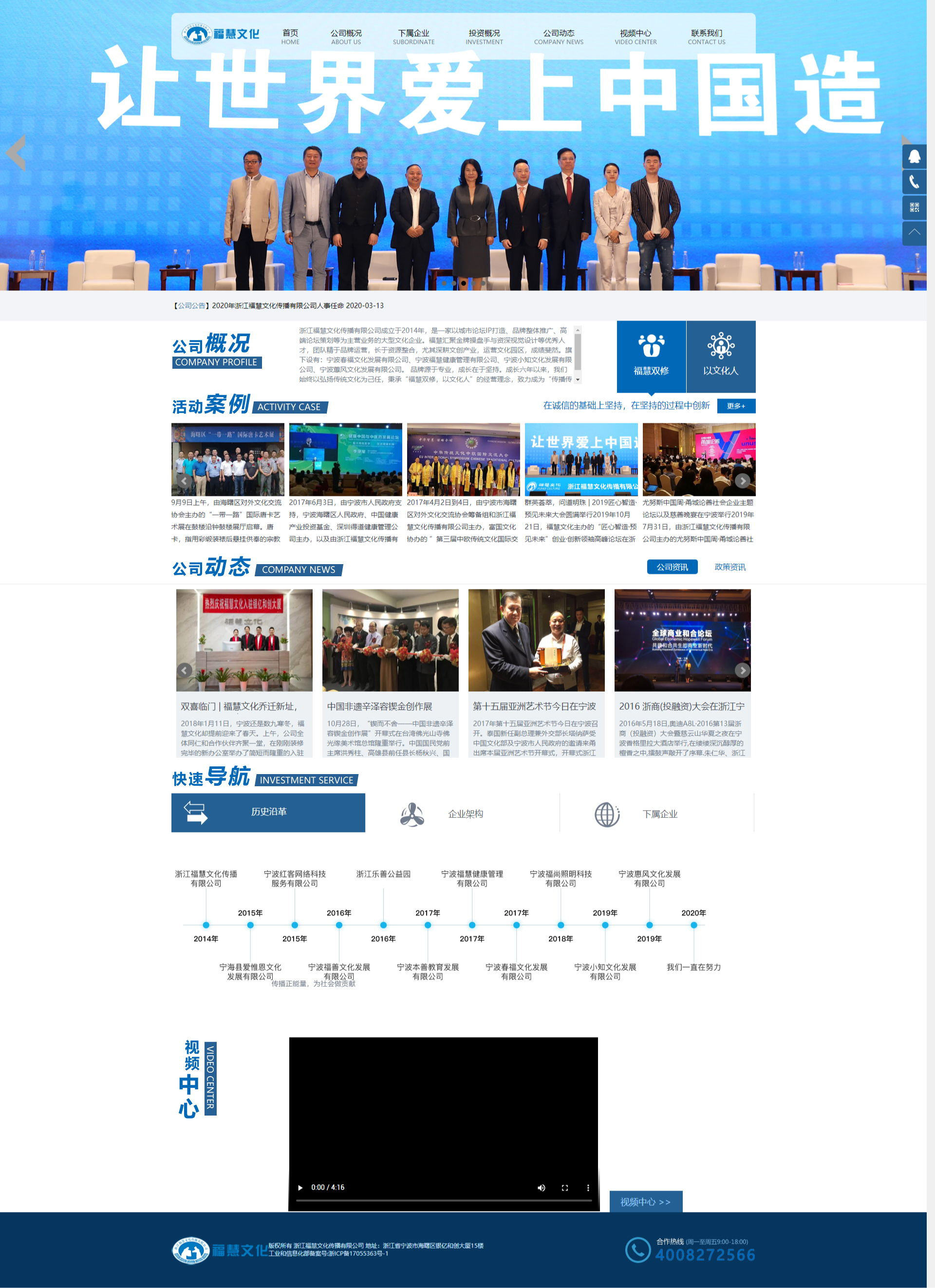 浙江?;畚幕瘋鞑ビ邢薰境闪⒂?014年,是一家以城市論壇IP打造、品牌整體推廣、高端論壇策劃等為主營業(yè)務的大型文化企業(yè)。?;蹍R聚金牌操盤手與資深視覺設計等優(yōu)秀人才,團隊精于品牌運營,長于資源整合,尤其深耕文創(chuàng)產(chǎn)業(yè),運營文化園區(qū),成績斐然。旗下設有:寧波福善文化發(fā)展有限公司、寧波春福文化發(fā)展有限公司、寧波小知文化發(fā)展有限公司、寧波蕙風文化發(fā)展有限公司。 品牌源于專業(yè),成長在于堅持。成長六年以來,我們始終以弘揚傳統(tǒng)文化為己任,秉承“?;垭p修,以文化人”的經(jīng)營理念,致力成為“傳播傳統(tǒng)文化正能量,創(chuàng)新傳統(tǒng)文化軟實力”的文化集團。
