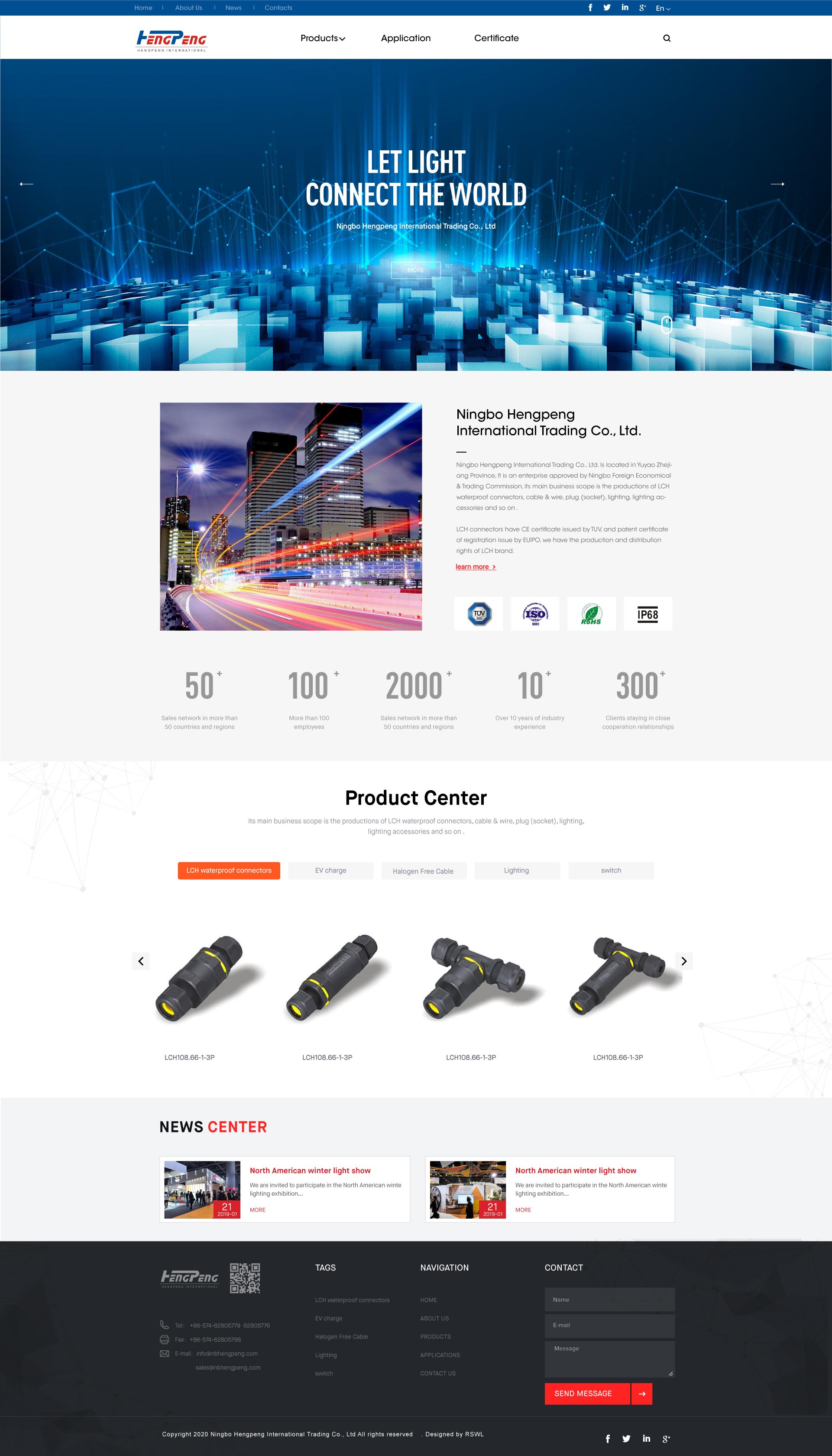 Ningbo Hengpeng International Trading Co., Ltd. Is located in Yuyao Zhejiang Province, It is an enterprise approved by Ningbo Foreign Economical & Trading Commission, its main business scope is the productions of LCH waterproof connectors, cable & wire, plug (socket), lighting, lighting accessories and so on .