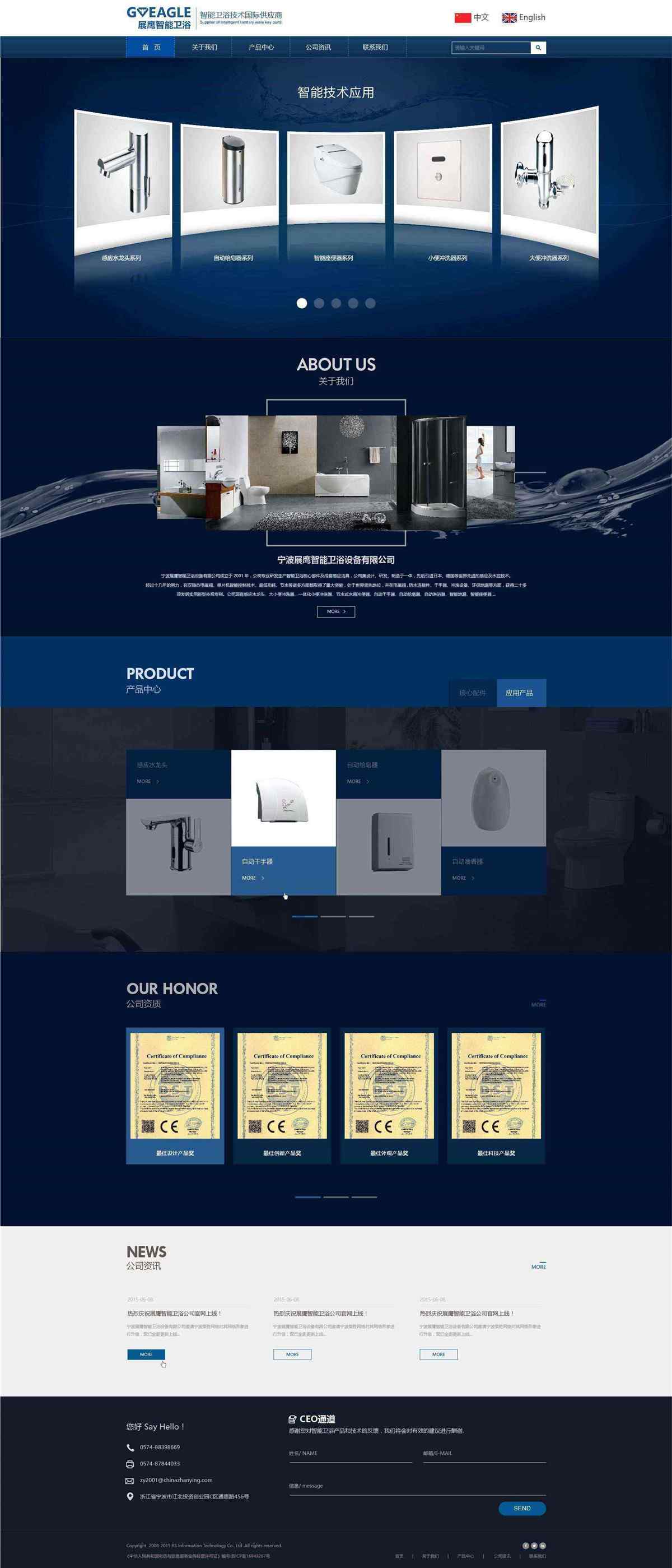 寧波展鷹智能衛(wèi)浴科技有限公司成立于2001年,公司專業(yè)研發(fā)生產(chǎn)智能衛(wèi)浴核心部件及成套感應(yīng)潔具,公司集設(shè)計(jì)、研發(fā)、制造于一體,先后引進(jìn)日本、德國等世界先進(jìn)的感應(yīng)及水控技術(shù)。經(jīng)過十幾年的努力,在雙穩(wěn)態(tài)電磁閥、單片機(jī)智能控制技術(shù)、超低功耗、節(jié)水等諸多方面都取得了重大突破,處于世界領(lǐng)先地位,并在電磁閥.防水連接件、干手器、沖洗設(shè)備、環(huán)保地漏等方面,獲得二十多項(xiàng)發(fā)明實(shí)用新型外觀專利。