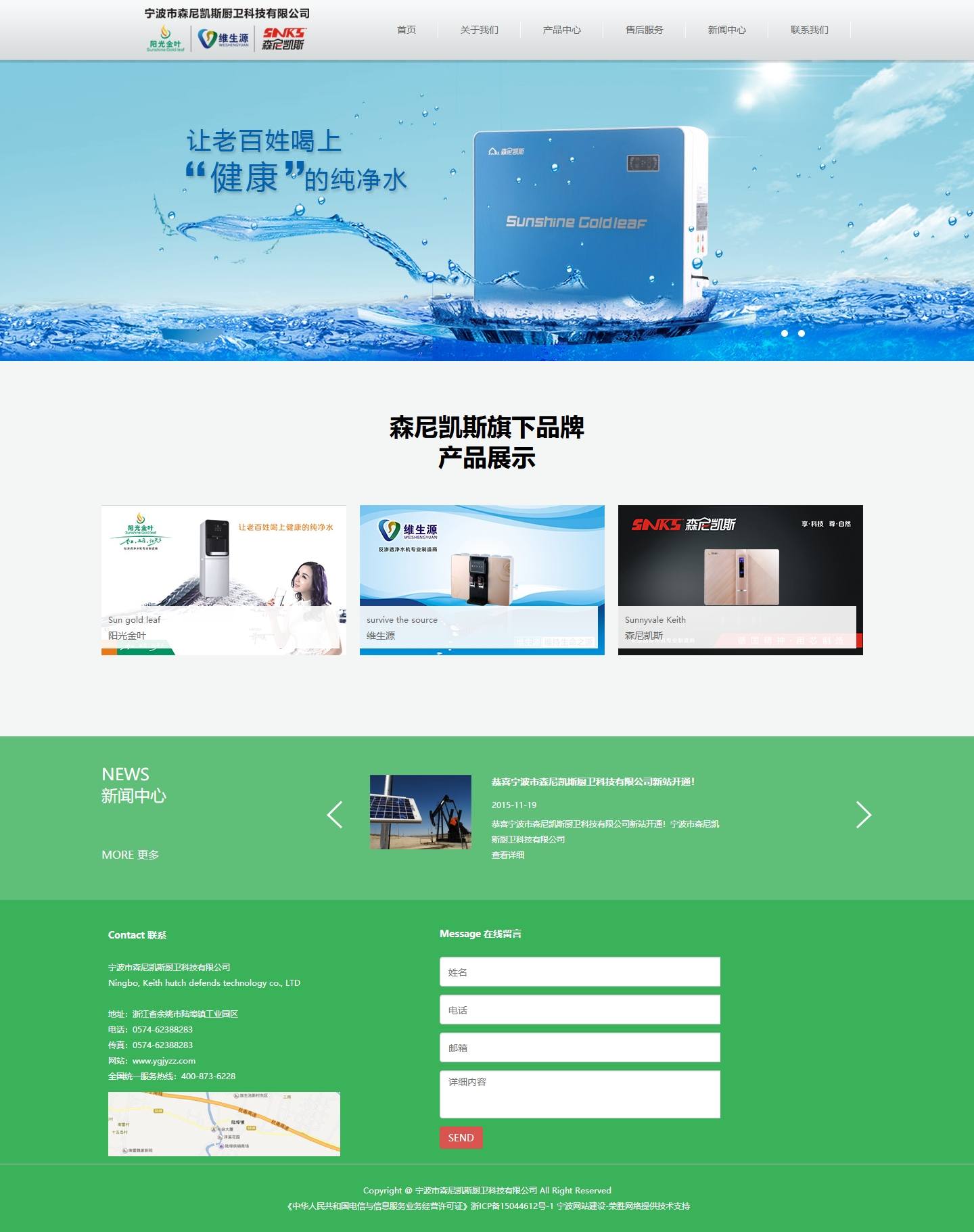 寧波市森尼凱斯廚衛(wèi)科技有限公司是一家實業(yè)型高端定位的專業(yè)生產(chǎn)凈水機企業(yè),目前有三大品牌如下:陽光金葉、維生源、森尼凱斯。在產(chǎn)品研發(fā)領(lǐng)域,擁有超水平的產(chǎn)品開發(fā)團隊,在制造營銷領(lǐng)域擁有前衛(wèi)完善的可復(fù)制型經(jīng)營模式,我們一直致力于成為最優(yōu)秀的水處理設(shè)備制造商之一、同時努力創(chuàng)建中國水處理行業(yè)最有價值品牌之一。公司生產(chǎn)的家用、商用凈水機,采用了21世紀最尖端的超濾和反滲透兩大核心技術(shù),能全方位解決家庭及辦公場所的飲用水問題。